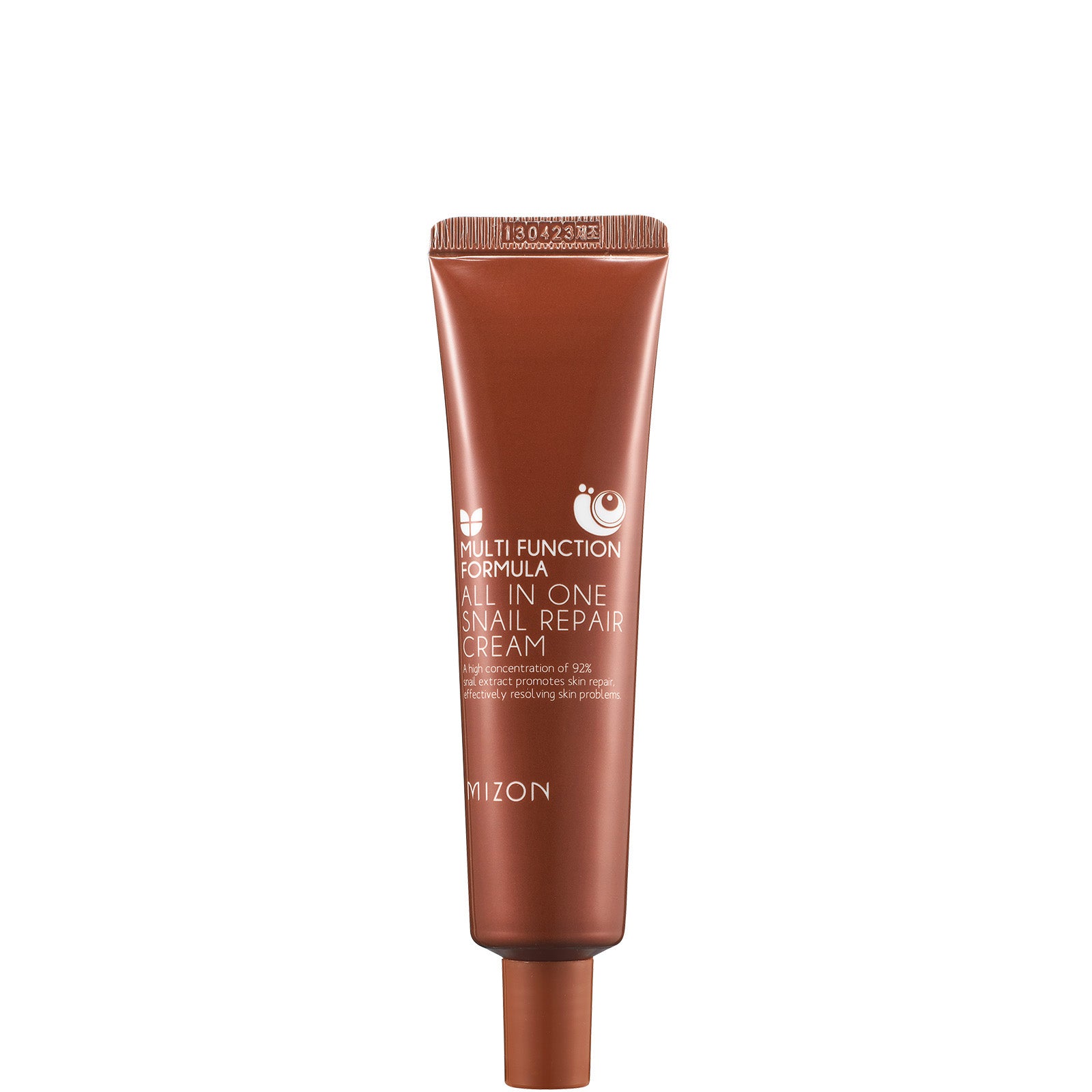 MIZON All In One Snail Repair Cream Miniature helps repair acne scars and improves skin elasticity, tone, complexion, and skin barrier. This all in one cream also diminishes wrinkles and helps repair skin while maintaining skin moisture levels through it's main ingredient, 92% snail secretion extract.