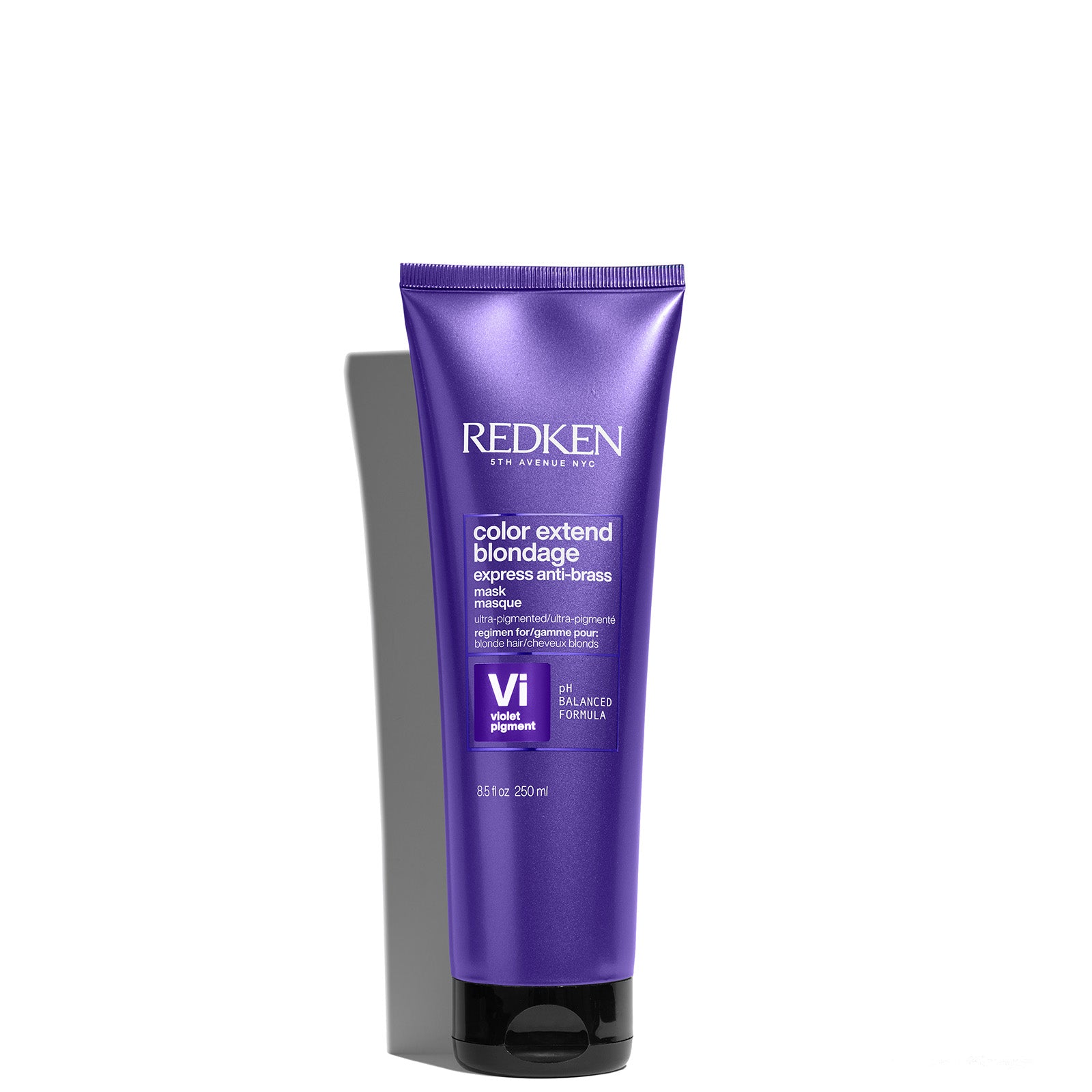 Redken's Color Extend Blondage Express Anti-Brass Mask is an ultra-pigmented purple hair mask and deep conditioner that ensures brighter, cooler blonde haircolor in just 5 minutes. Featuring a powerful purple toning formula, this hair mask helps to color correct and neutralize unwanted yellow undertones in even the brassiest blonde hair color.