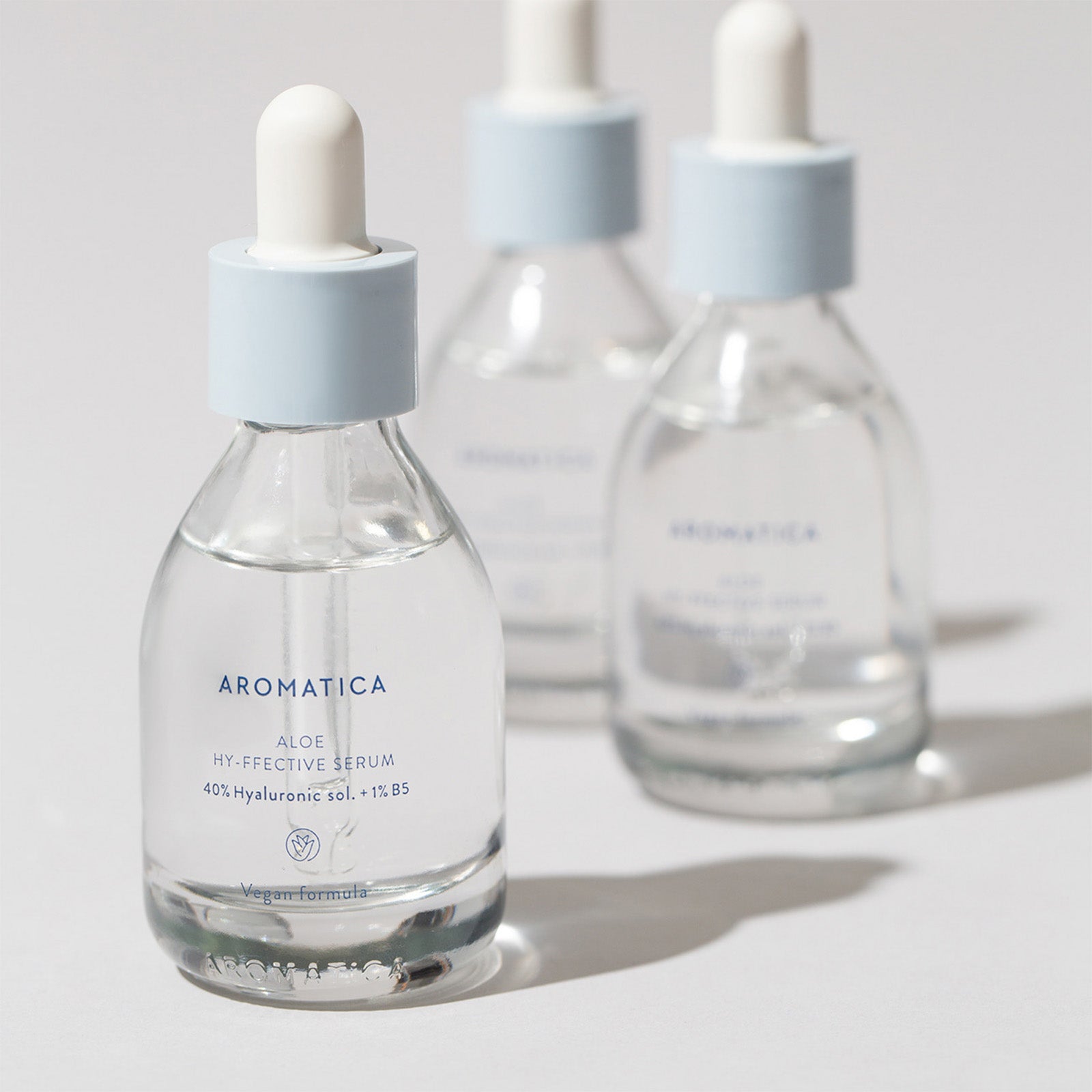 AROMATICA Aloe Hy-ffective Serum 40% Hyaluronic sol. + 1% B5is a highly concentrated, lightweight moisturising serum that strengthens the skin barrier and will deeply hydrate the skin.