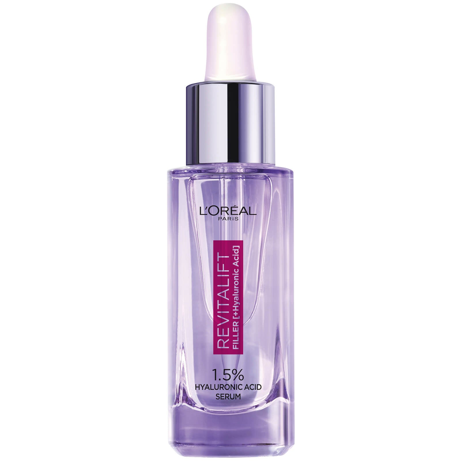 L'Oréal Paris® Revitalift Filler 1.5% Pure Hyaluronic Acid Serum has been specifically developed to deliver an advanced anti-wrinkle efficacy with a rapid absorption and non-greasy finish. A scientifically formulated blend of 2 forms of pure Hyaluronic Acid, to help retain skin's own moisture: 0.5% Macro Hyaluronic Acid to intensively rehydrate and smooth skin surface by retaining 1000x its weight in water and 1% of Micro Hyaluronic Acid to penetrate into skin's surface layers to help plump out wrinkles.