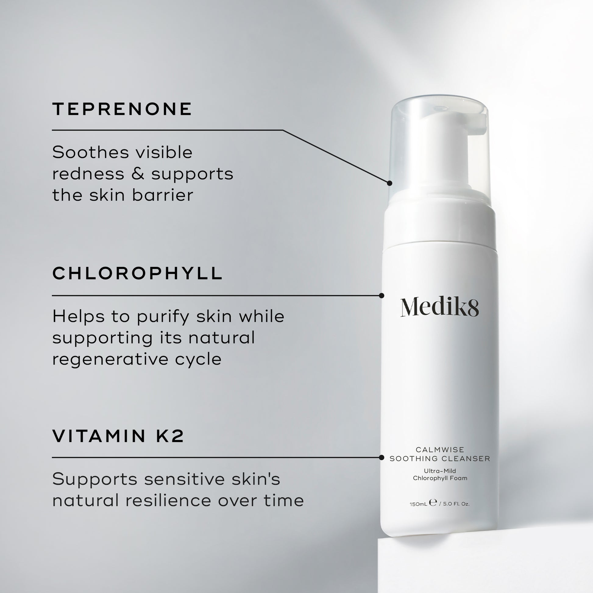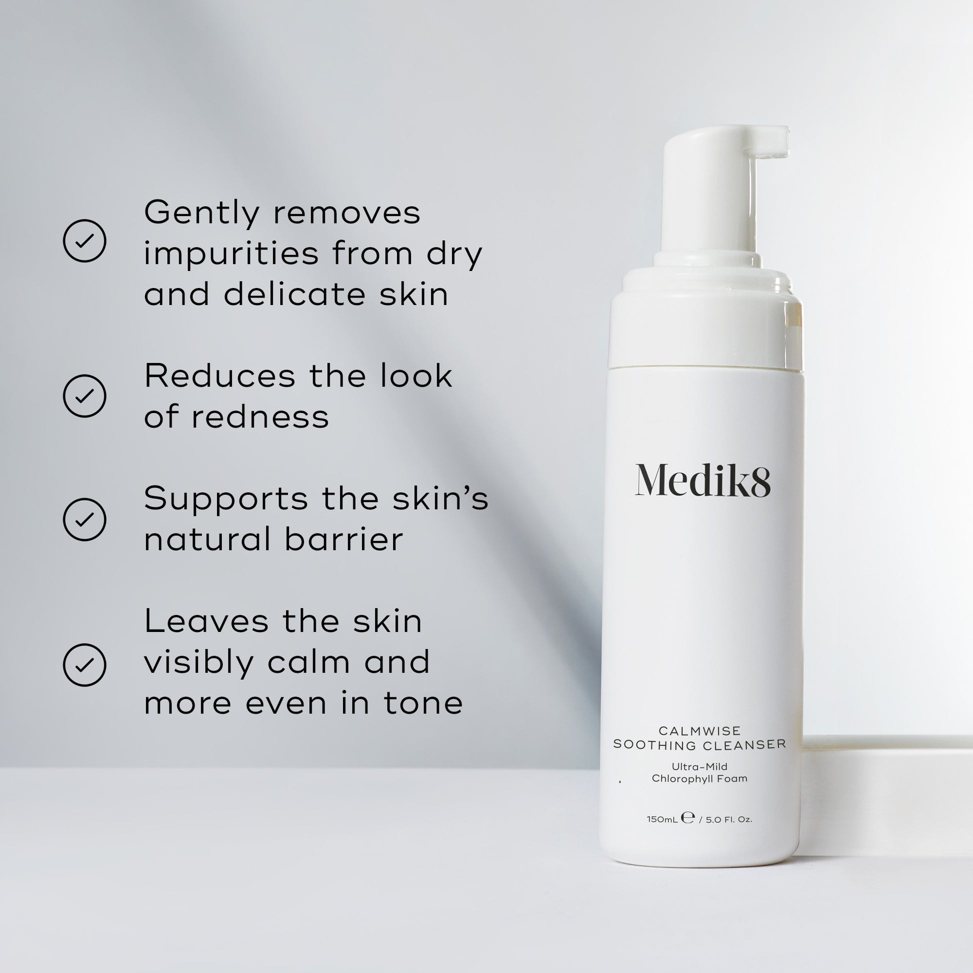 Suitable for sensitive skin, the Medik8 Calmwise Soothing Cleanser washes away daily impurities and debris while reducing visible redness.