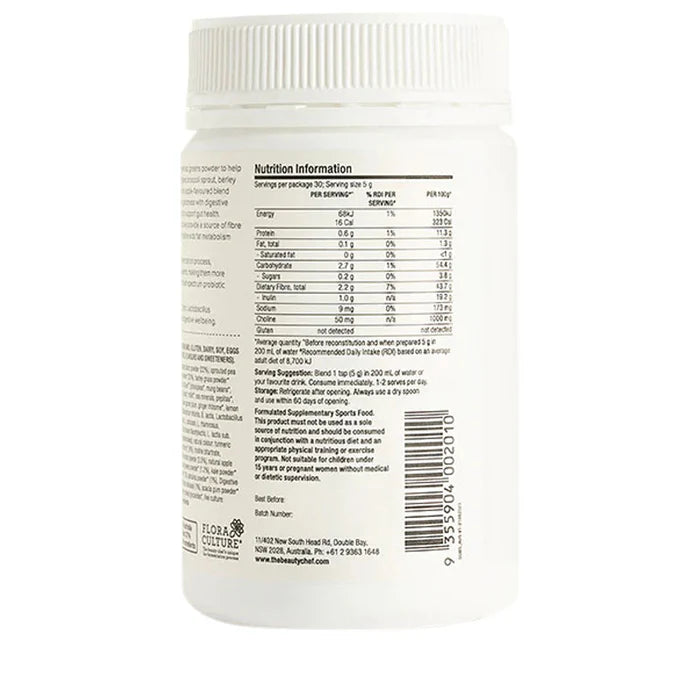 ,Cleanse Blend [(green banana resistant starch powder (22%), sprouted pea fibre powder* (20%), Jerusalem artichoke inulin powder* (20%), barley grass powder* (9.7%))], Bio-Fermented Nutrient Blend with Flora CultureTM [(chickpeas*, mung beans*, brown rice*, sweet potato*, lentils*, buckwheat*, quinoa*, millet*, sea minerals, pepitas*, linseed*, sunflower seeds*, agave*, molasses*, queen garnet plum, ginger rhizome*, lemon juice concentrate, lactic acid starter culture (Bifidobacterium infantis, B. lactis, Lactobacillus acidophilus, L. delbrueckii sub. lactis, L. fermentum, L. paracasei, L. rhamnosus, Lactococcus lactis sub. cremoris, L. lactis sub. lactis biovar diacetylactis, L. lactis sub. lactis, Leuconostoc mesenteroides, L. pseudomesenteroides)), natural colour: turmeric rhizome*, anthocyanins (from black carrot), maqui berry*] (8%), choline bitartrate, milk thistle extract powder (2.5%), globe artichoke extract powder (2.5%), natural apple flavour, apple cider vinegar powder* (2.2%), collard greens