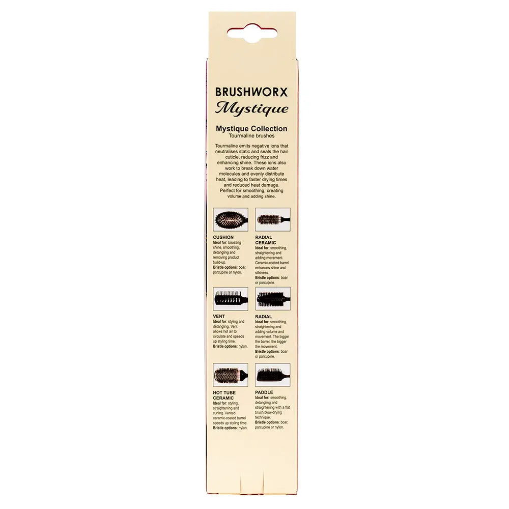 Experience effortless styling with the Brushworx Mystique Tourmaline Radial Hot Tube Medium 55mm, crafted to deliver professional-quality results. Tourmaline-infused bristles release negative ions to neutralise static, smooth frizz, and boost radiant shine. The 55mm barrel is ideal for creating soft, medium-sized curls, waves, and volume, while the radial design provides excellent maneuverability and precise control. The vented hot tube barrel ensures even heat distribution for faster drying times and reduced heat damage, making styling quicker and healthier for your hair.