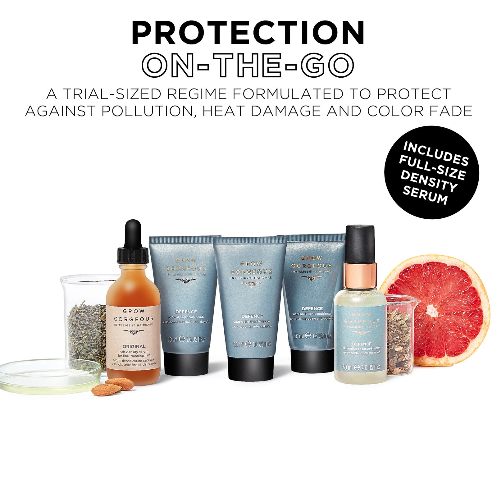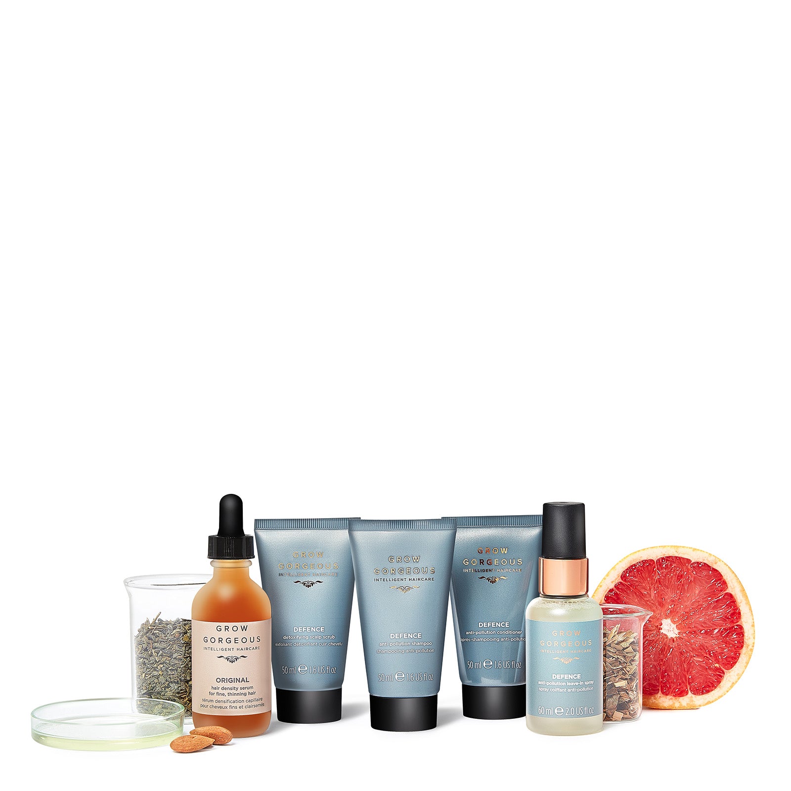 Maintain healthy hair with the Grow Gorgeous Defence Discovery Kit. This transformative regime features a collection of trial-sized essentials, formulated to protect against urban pollution, heat damage and colour fade. Purify your scalp and shield your strands with this expertly curated line-up of detoxifying heroes, offering daily protection from environmental aggressors to reveal strong, healthy hair in five simple steps.