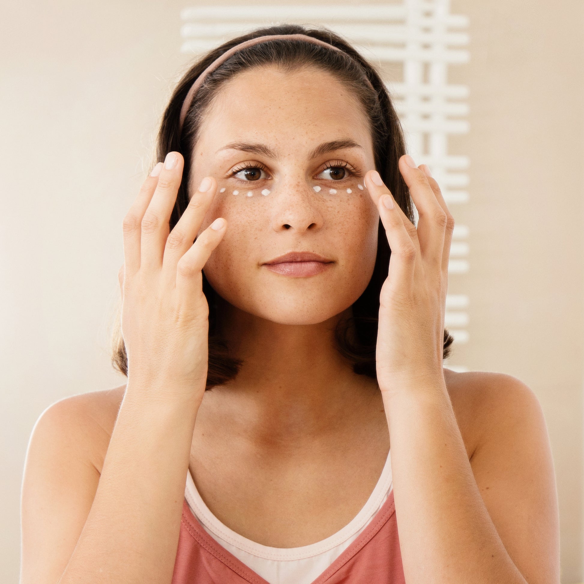 - Beginning at the outside of the eye, gently pat the cream under the eye towards the nose, then over the eyelid from the nose outwards.