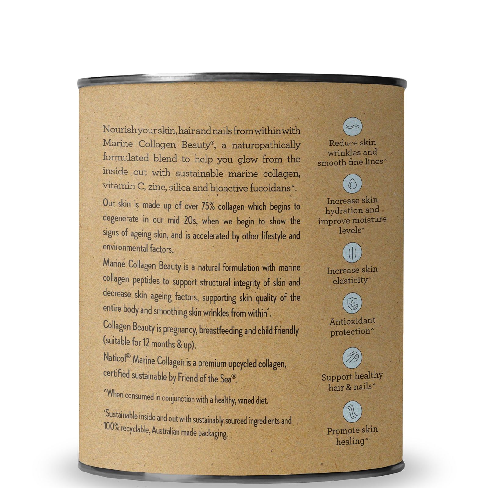 Marine Collagen Beauty is a natural solution to support glowing skin, lustrous hair, strong nails, and gut health. Its advanced formulation promotes skin integrity and helps decrease visible signs of ageing, enhancing skin quality from within.