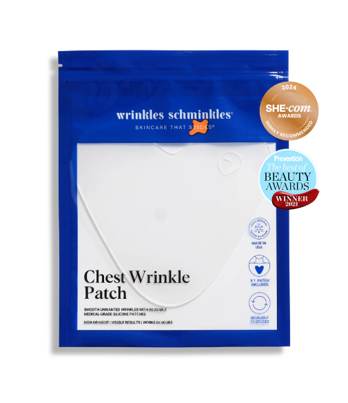 Wrinkles Schminkles Silicone Chest Wrinkle Patch is a non-invasive chest wrinkle treatment to smooth out the chest and cleavage wrinkles caused by sleeping on your side, ageing and sun damage. Apply at night and wake up to a refreshed and visibly softer looking decollete area.