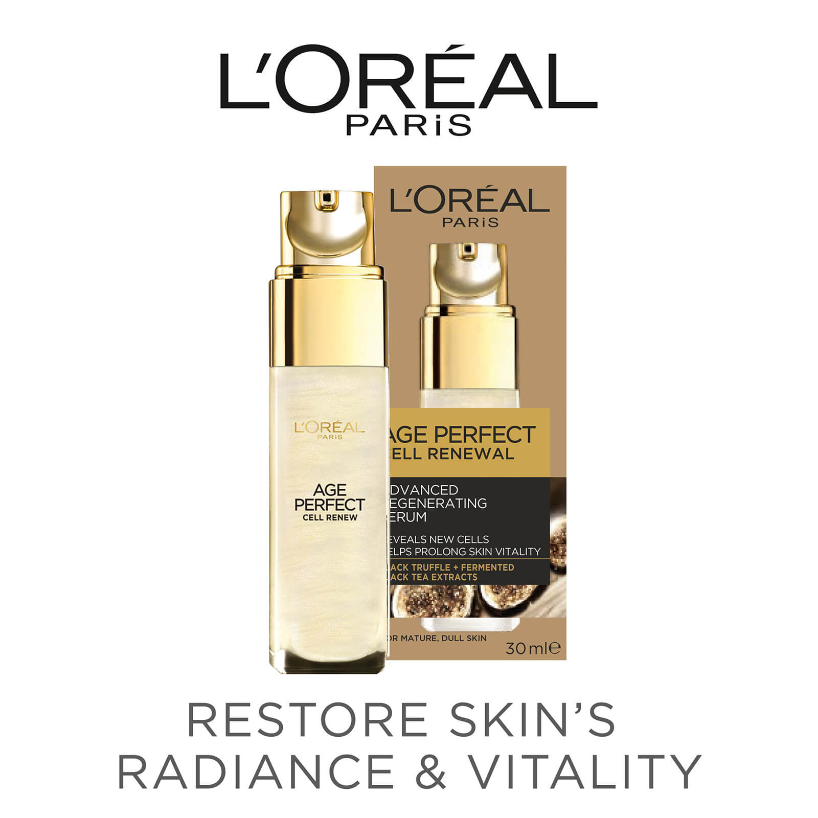 L'Oréal Paris® Age Perfect Cell Renewal Regenerating Serum is enriched with Black Truffle extract, Kombucha and micro-reflectors to give your skin a boost of radiance and prolong skin's vitality.