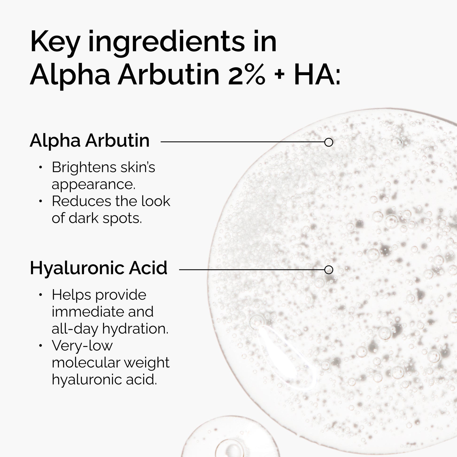 Alpha Arbutin 2% + HA is a water-based serum specifically designed to even skin tone and minimize the appearance of dark spots. This dark spot correcting serum combines a potent concentration of purified alpha arbutin, a well-known skin brightening ingredient, with hyaluronic acid.