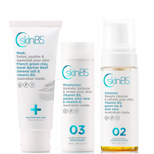 Created and developed in Australia, SkinB5 is the world’s first supplement based effective, long-term acne solution. Acne is more just skin deep, so the entire SkinB5 range is scientifically formulated using vitamin B5 and other powerful skin health nutrients to normalise sebum production, balance hormones, improve immune response, relieve stress and support cell renewal, starting with supplement formulations that treats acne from the inside, supported by healing skincare products on the outside.
